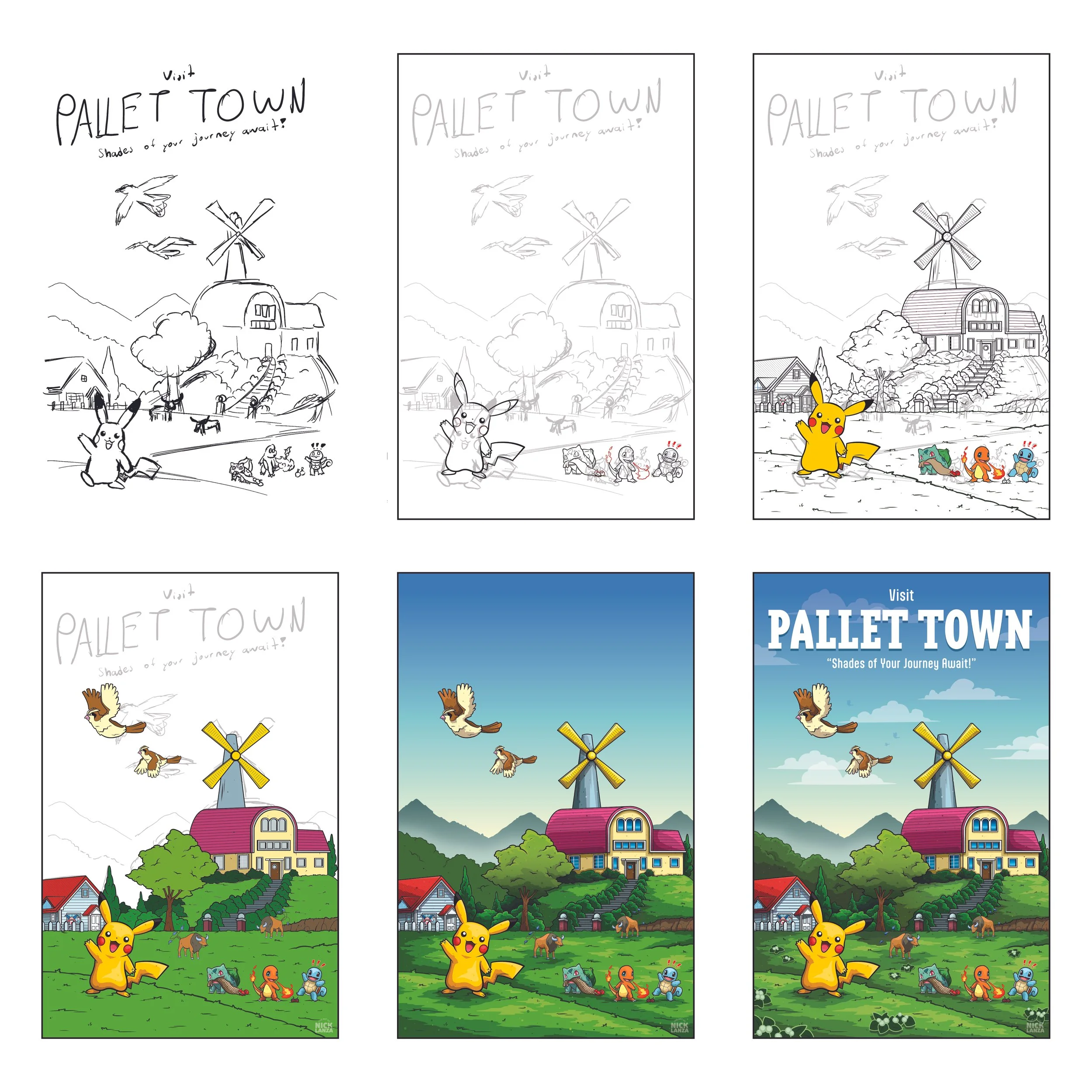 Each poster begins as a rough sketch on Procreate for the iPad. The sketch is then taken into Adobe Illustrator for the final linework and coloring.